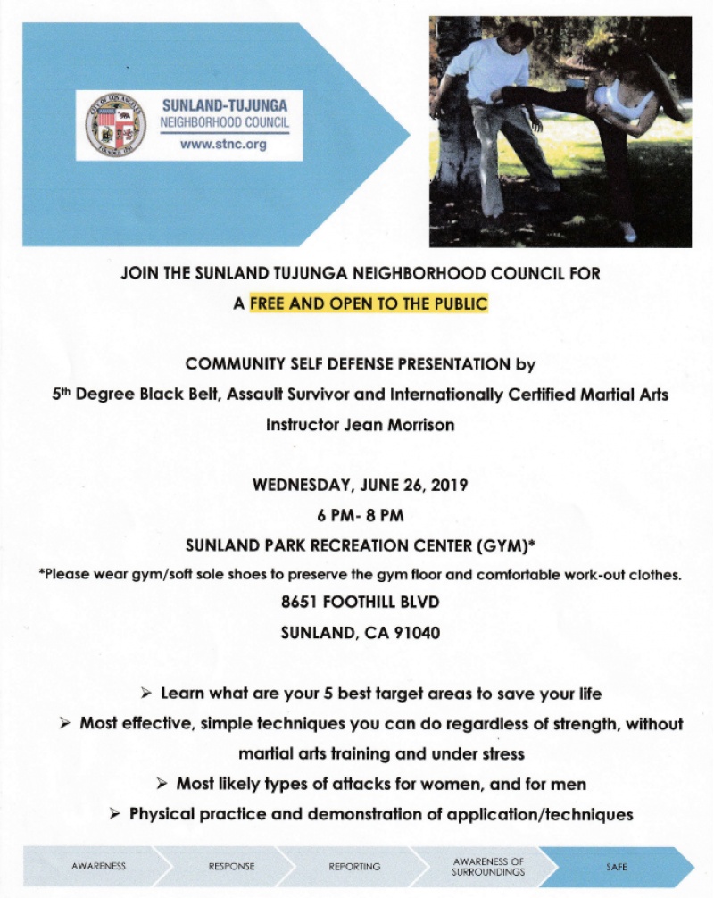 Community Self Defense Presentation hosted by the Sunland-Tujunga Neighborhood Council @ Sunland Rec Ctr GYM 6 p.m.